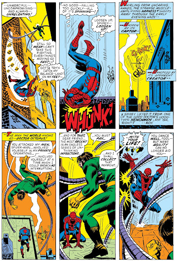Note to Heroic Adventure Super Hero Comic Book Artists. THIS is how you stage a 3 page battle between a superhero and one of his most deadly foes. Because Spidey isn’t well… his banter is almost nil (we hear his thought’s, but they are about survival). You can’t have a hero on his heels and yet make him smug - and Doc Ock SOUNDS and LOOKS like he’s moving in for the kill… the difference between writing dialogue like this for the Porcupine or the Cowled Commander is crucial…. THIS is a dangerous foe.